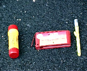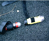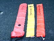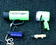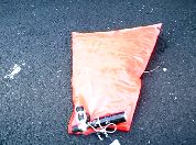Polyform buoys vary in colour and size. Red, orange and pink are the most common although some divers use bright yellow. These were used in paired combinations and separated by a minimum of 2 m. These buoys had a diameter of approximately 40 cm. These devices are typical of those used by shellfish divers for position marking. Delayed SMB's included a red AP Valves self-inflating decompression marker buoy, red AP Valves decompression sausage (self sealing), and Bowstone red and yellow decompression sausages (open ended). The torches that were selected represented a range of power outputs and are typical of those used by divers as main and backup torches. Two types of marker dye were tested. Sea-Streak from Advanced Diving Products is a small tablet of solid dye that slowly dissolves when a white tear seal is pealed from the plastic pouch and exposed to water. Sea Marker Dye (from Presto Dyechem) retailed by BCD International is also a small plastic pouch which is pealed apart to release a cloth bag on a length of tape containing powdered dye. Both types of dye release a plume of bright green dye on contact with water. The folding diver's flags are assembled from three sections of hollow white plastic pipes that slot into couplings to form a pole 1.8 m in length. When folded, the pole sections are held together by a length of bungee cord running through the centre of each section. A square coloured pennant is attached to one end.