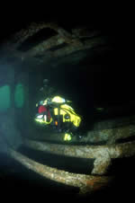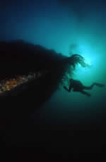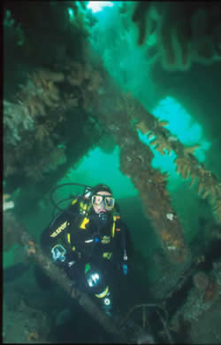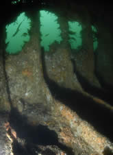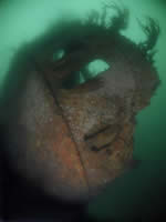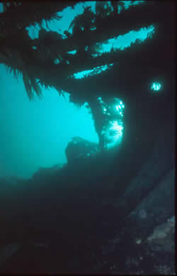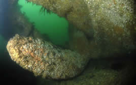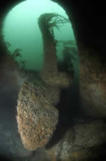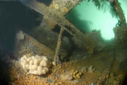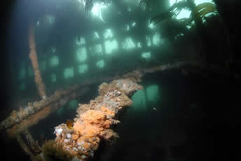 Gobernador Bories. Chilean registered 2.332-ton steamer sunk in position in Burra Sound in 1915. She lies in 16-21 metres of water with a list to starboard. A strong tidal stream through Burra Sound means she can only be dived at slack waters. The hull amidships is fairly broken up, and the decking has collapsed in most parts giving easy access to inner parts of this wreck. The bow and starboard side of the hull are fairly intact, and the stern still boasts her large propeller and rudder. This same tide ensures good visibility, and the wreck is teeming with life, and you are usually followed around the wreck by large ballen wrasse waiting to be offered a tasty morsel. This dive is a real must for photographers. (see below)